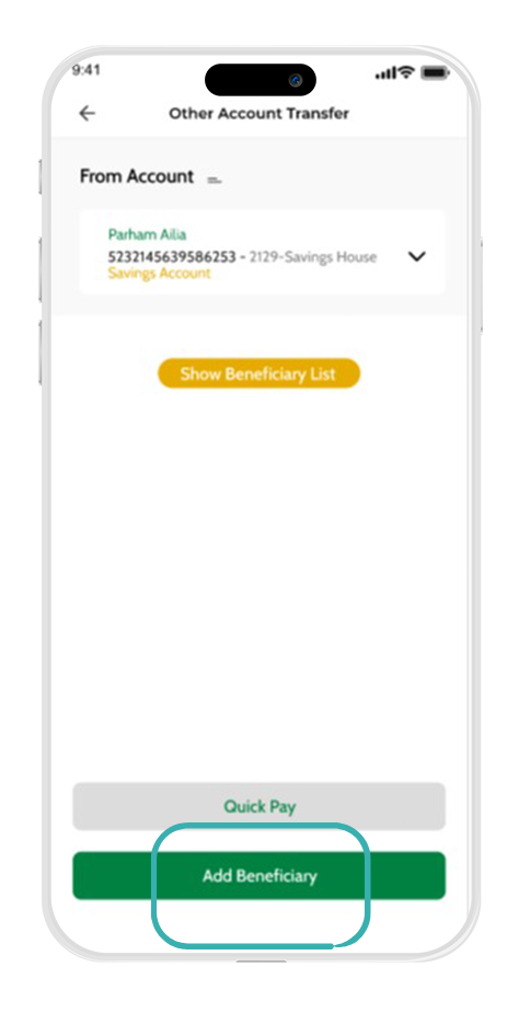6. The system will automatically detect the account holder’s name. Optionally, enter a Nickname and Number. Click on "Save Beneficiary."