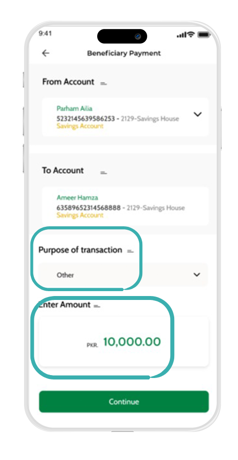 5. Enter the Purpose of transaction and Amount. Click on "Continue"