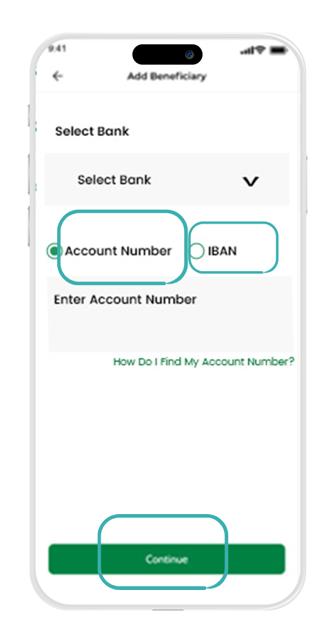 5. Choose "Account Number" or "IBAN" and enter the required details. Click "Continue".